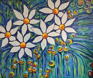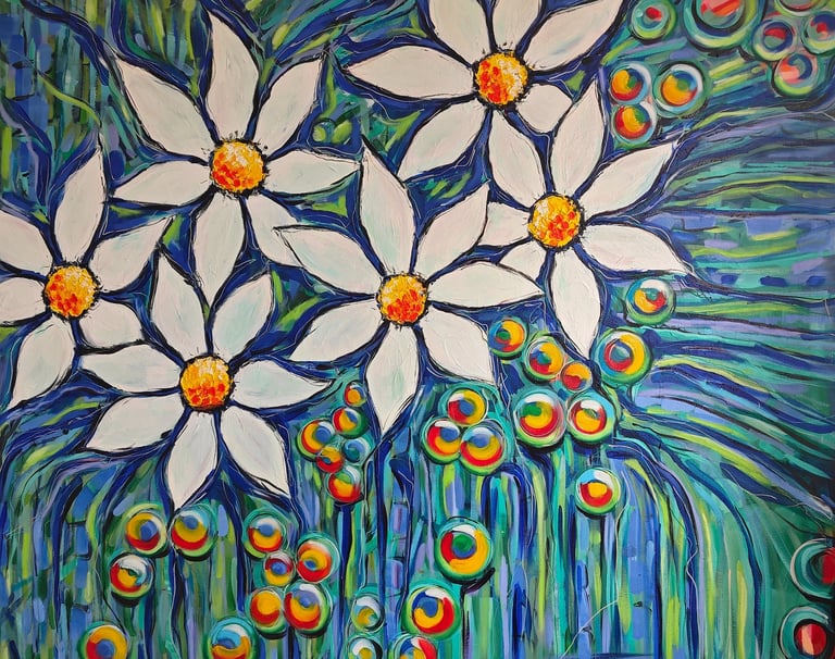 The painting is not just about a garden, but about existence itself: our search for a centre of calm and authenticity (the white flowers) in the inevitable, and often beautiful, chaos of modern life (the pop garden). It is a hymn to serenity that does not flee from life, but rather stands proud and bright in the midst of it.