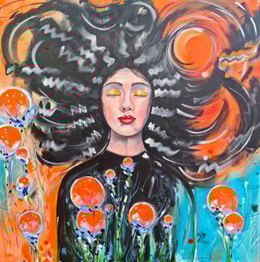 In this painting, feminine energy is revealed in all its complexity: welcoming as pink, passionate as orange, vital as green, intuitive as turquoise and mysterious as black.
