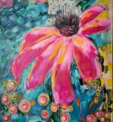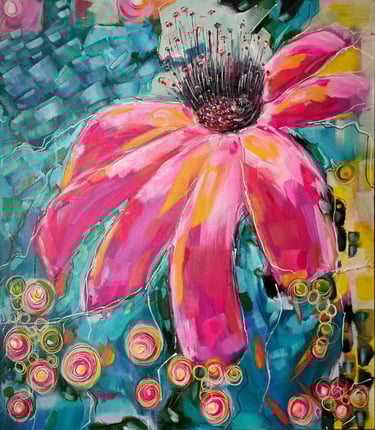 At the centre is a pink flower. Not a soft, muted pink, but an explosive, vibrant, almost electric pink. Its petals are courageous, opening up in spite of everything, revealing a heart that beats strongly. That flower is me, in my most daring gesture: that of existing, fully and without apology, just when I felt I had to prove myself worthy of my place in the sun.