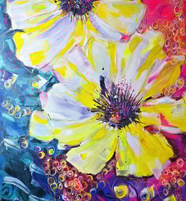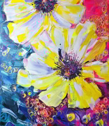 The balance of the painting stems from a contrast. The pop garden is collectivity, noise, movement. The six white flowers are individuality, silence, calm. Each of them, although identical in shape, has a very slight difference in inclination, as if each were dancing its own silent dance in the noisy party of the world.